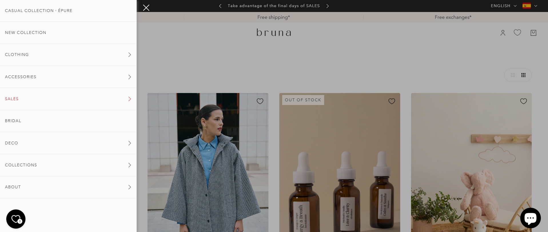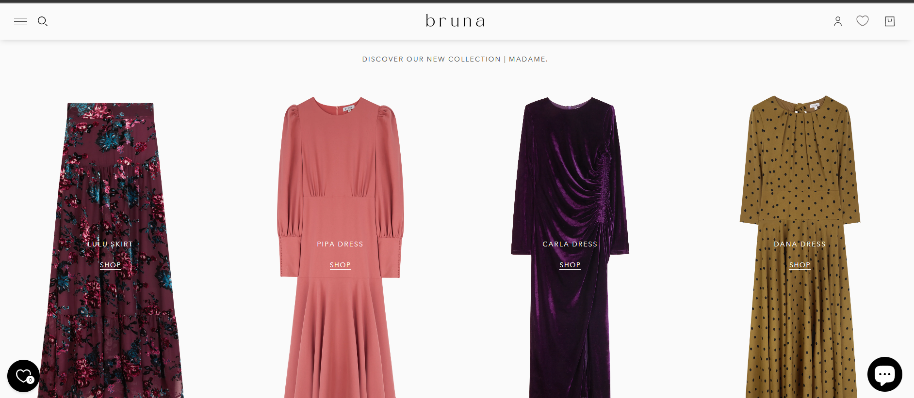 En la Página de Inicio, los visitantes son recibidos con una presentación de las colecciones más recientes, donde el diseño y la sostenibilidad se encuentran para ofrecer prendas únicas. Con una estética visualmente atractiva, Bruna invita a sus visitantes a descubrir una línea de moda que combina lo mejor de la alta costura y el respeto por el medio ambiente.
