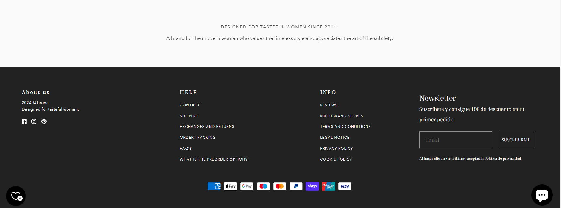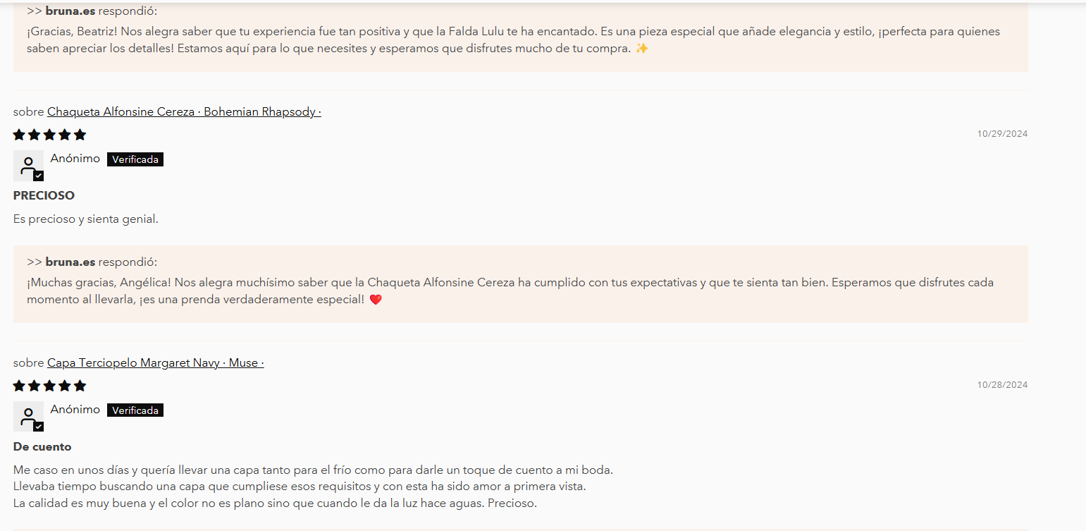 Para facilitar la experiencia del cliente, Bruna ofrece un servicio de atención al cliente personalizado a través de su página de contacto, donde los visitantes pueden realizar consultas o recibir asesoramiento de moda. Además, la Tienda en Línea está diseñada para ofrecer un proceso de compra intuitivo y seguro, brindando opciones de envío rápido y métodos de pago confiables.