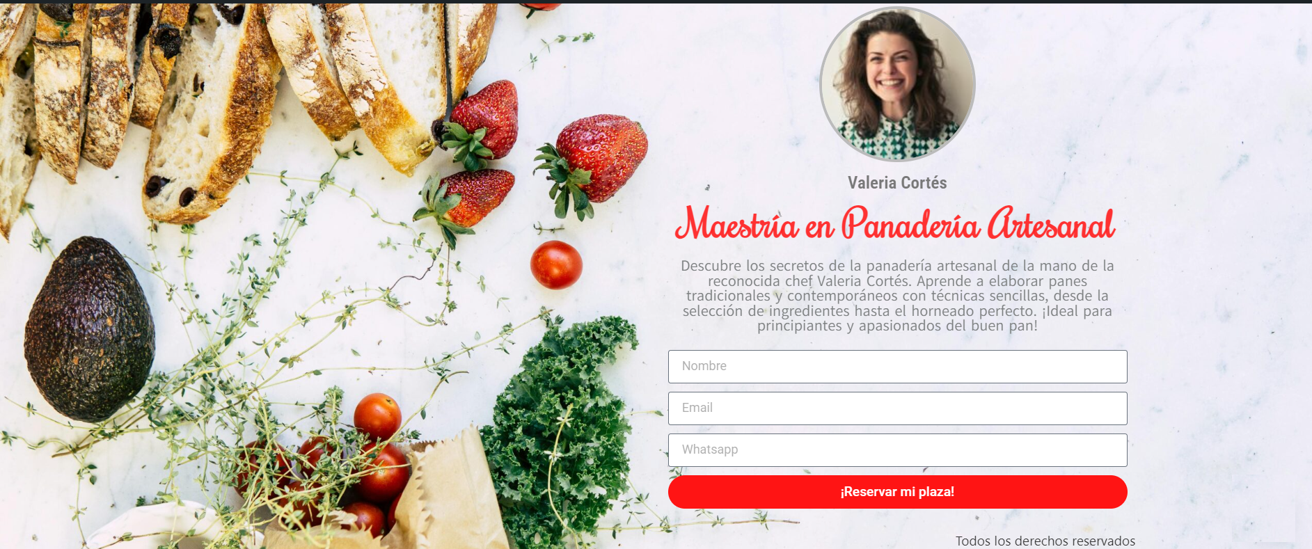 Esta plataforma web ha sido diseñada con el objetivo de captar alumnos interesados en aprender panadería artesanal de la mano de Valeria Cortés, chef especializada en técnicas tradicionales y recetas auténticas. Con un diseño cálido y profesional, la página está optimizada para atraer estudiantes y facilitar su inscripción en el curso.