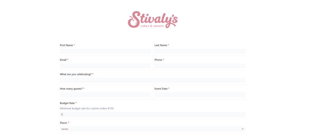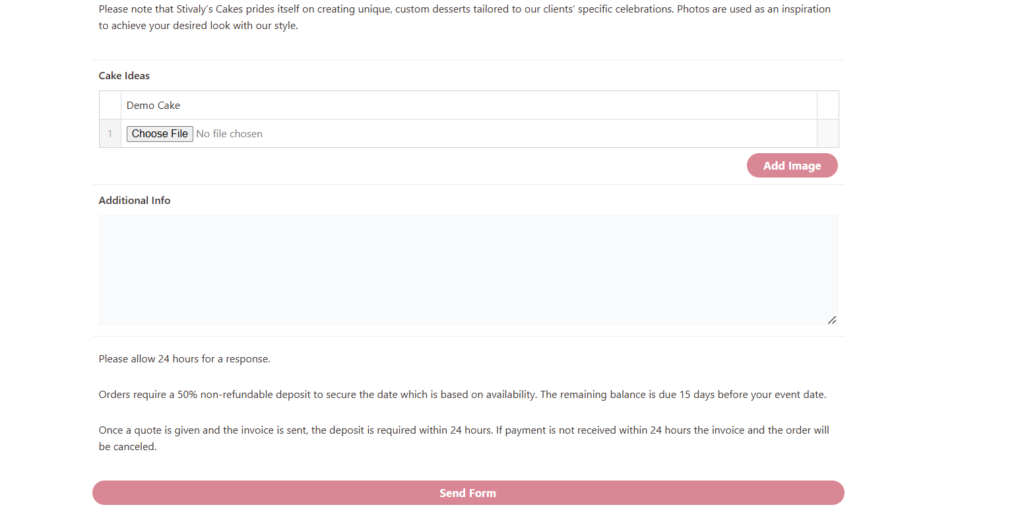 Para aquellos que desean realizar un pedido o consulta, la página cuenta con un sencillo Formulario de Pedido, donde los clientes pueden especificar detalles sobre el pastel que desean encargar. Adicionalmente, un Botón de WhatsApp está disponible para ofrecer una comunicación directa e inmediata, permitiendo a los clientes resolver dudas y concretar detalles adicionales sobre sus pedidos.