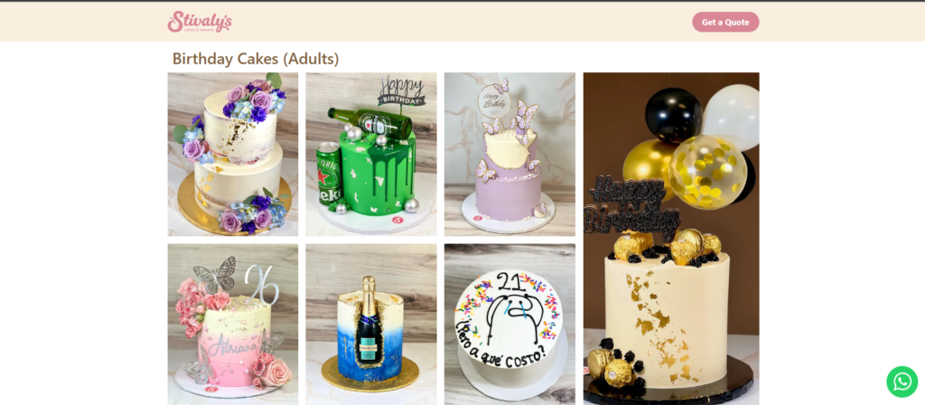 Con una navegación simple y un diseño enfocado en la calidad visual de sus productos, la página web de es el lugar perfecto para quienes buscan un pastel personalizado, lleno de estilo y sabor, que se adapte a la temática de su celebración. Pueden encontrar su dirección física y número de contacto en el footer.