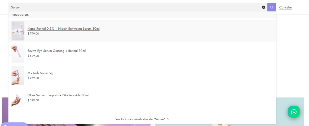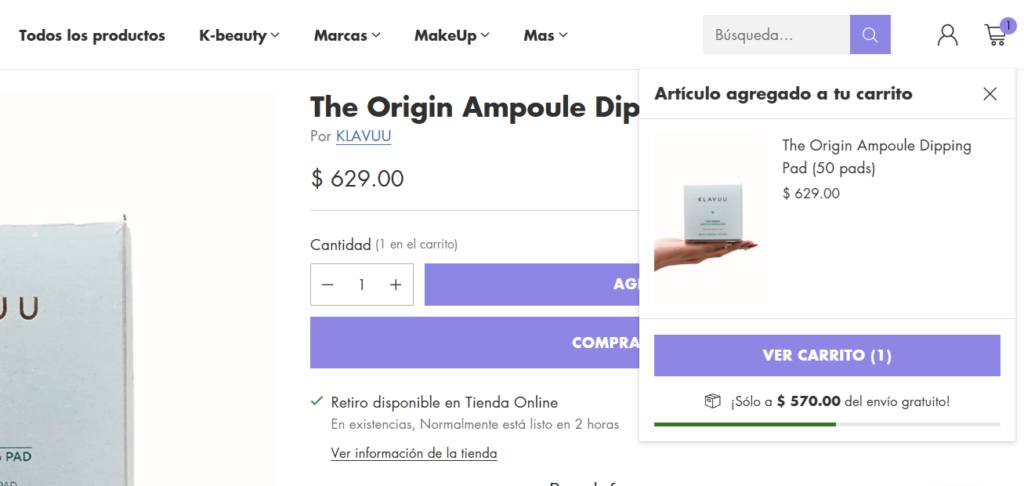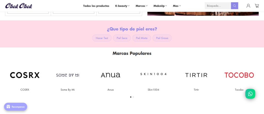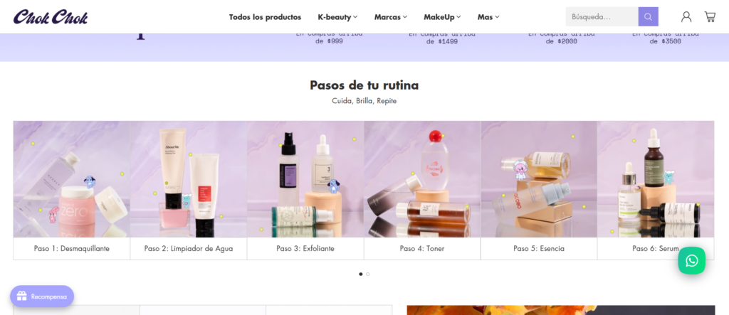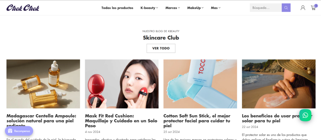 Las categorías de productos se despliegan en un menú lateral fácil de navegar, que organiza los productos en secciones como limpiadores, sérums, cremas hidratantes, mascarillas y maquillaje, guiando a los clientes hacia los productos adecuados para sus necesidades específicas. La página también incluye una sección editorial donde se exploran temas de belleza y cuidado de la piel, destacando consejos y rutinas inspiradas en la cosmética coreana.
