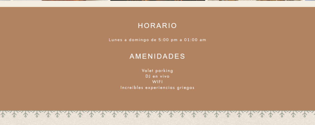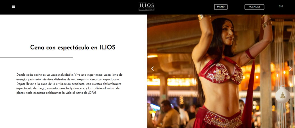 Como parte especial de la temporada, un Apartado de Navidad está dedicado a las Posadas Navideñas del restaurante. Un ícono de árbol navideño en la página invita a hacer clic y, al abrirlo, revela el programa completo de posadas, con cenas festivas y conciertos en vivo que crean una atmósfera alegre y única para celebrar la Navidad al estilo griego. Este apartado también permite a los visitantes reservar su lugar para las posadas y conocer los detalles de cada noche especial.