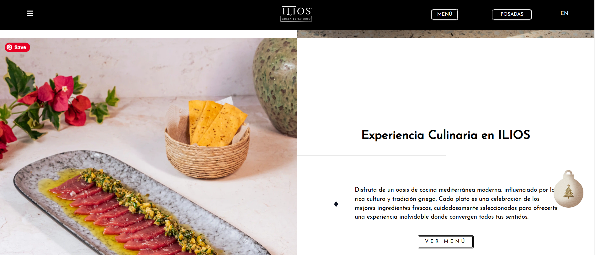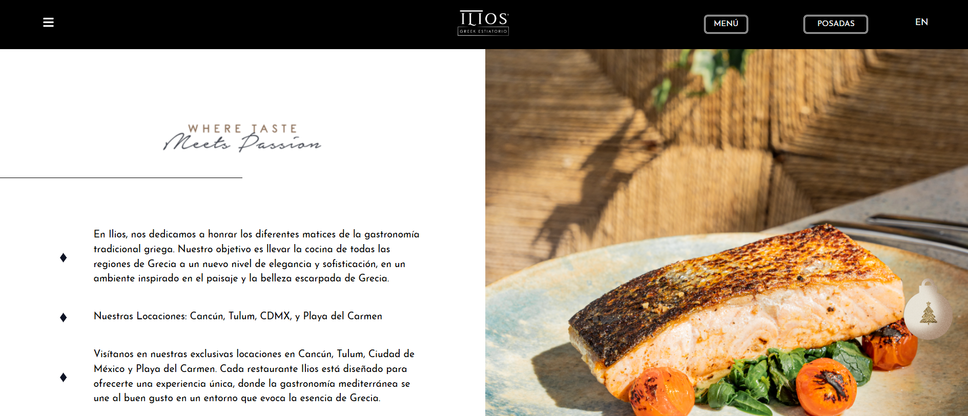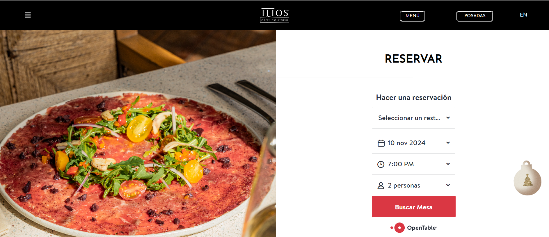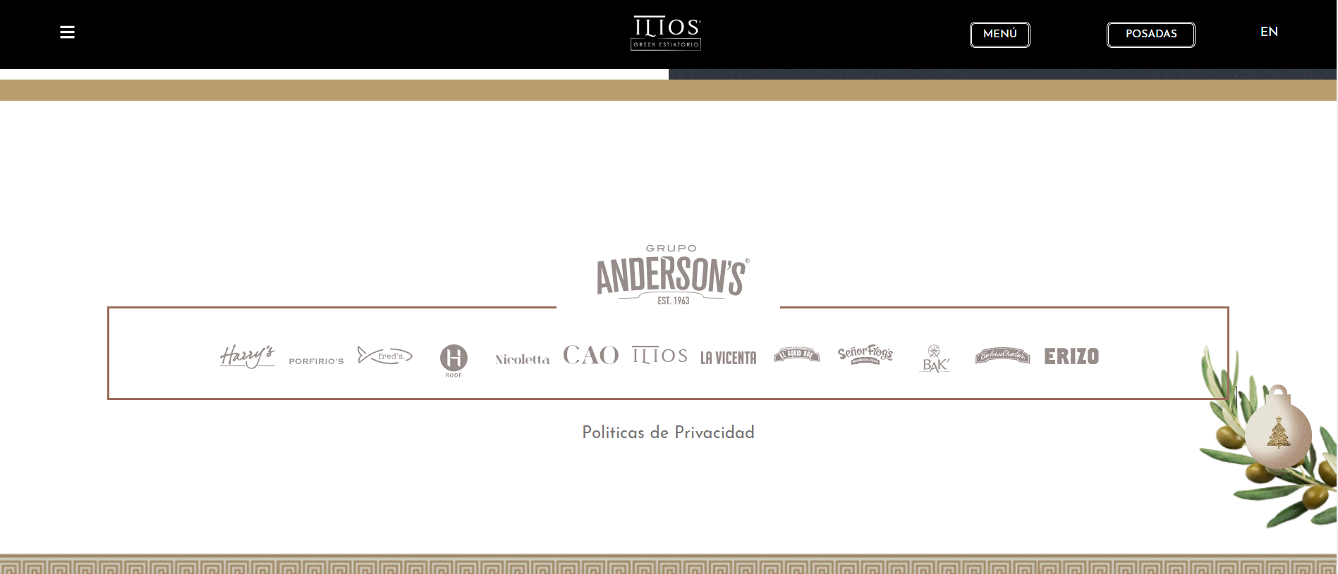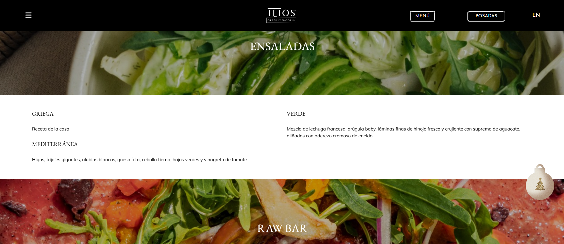 Como parte especial de la temporada, un Apartado de Navidad está dedicado a las Posadas Navideñas del restaurante. Un ícono de árbol navideño en la página invita a hacer clic y, al abrirlo, revela el programa completo de posadas, con cenas festivas y conciertos en vivo que crean una atmósfera alegre y única para celebrar la Navidad al estilo griego. Este apartado también permite a los visitantes reservar su lugar para las posadas y conocer los detalles de cada noche especial.