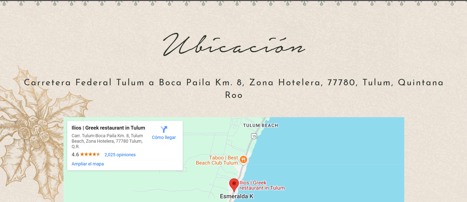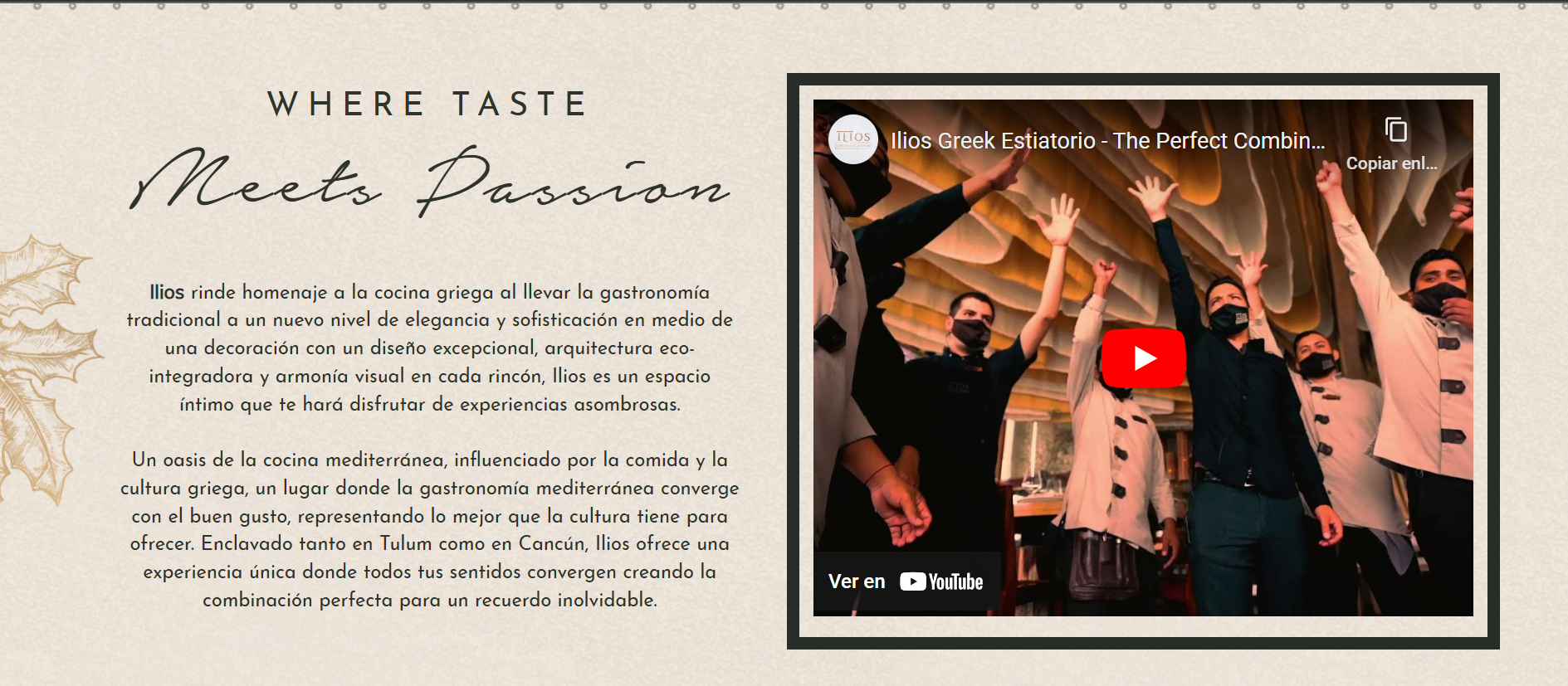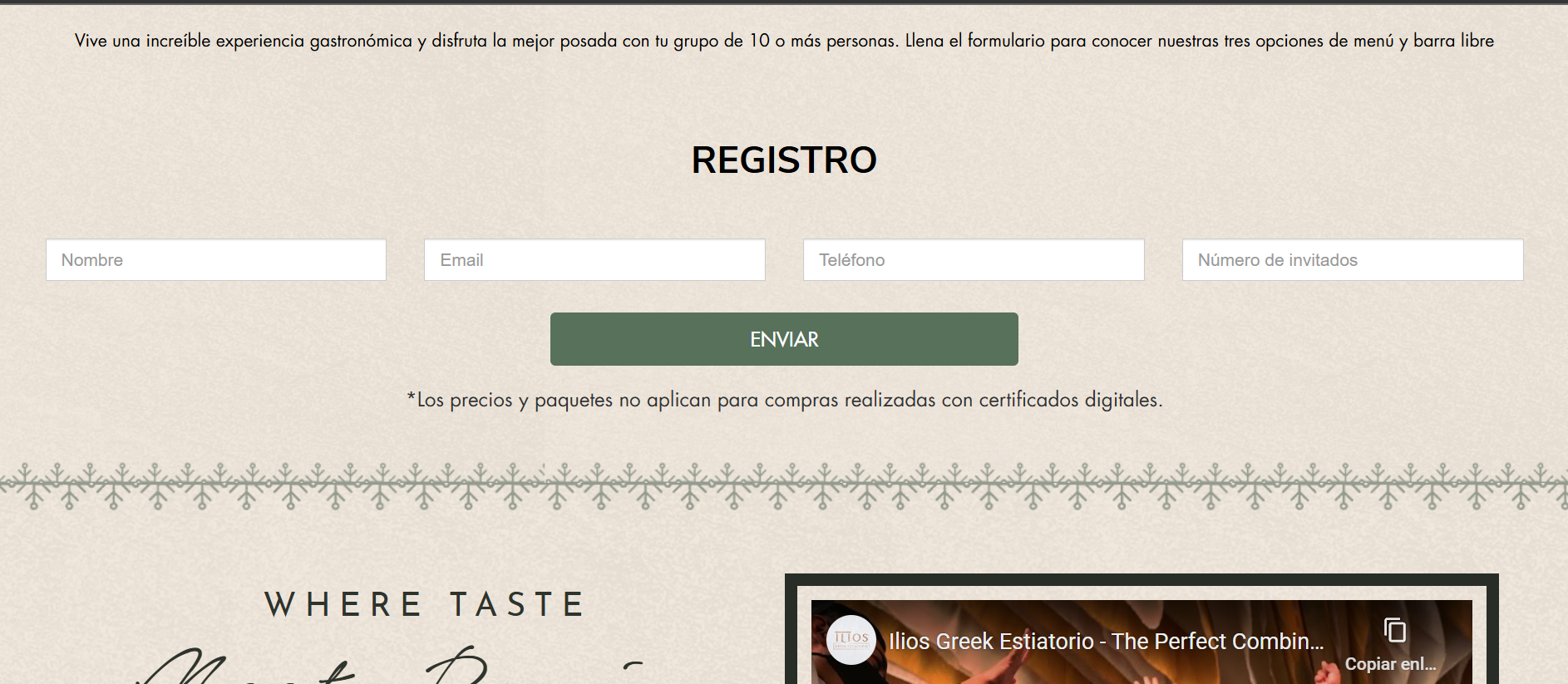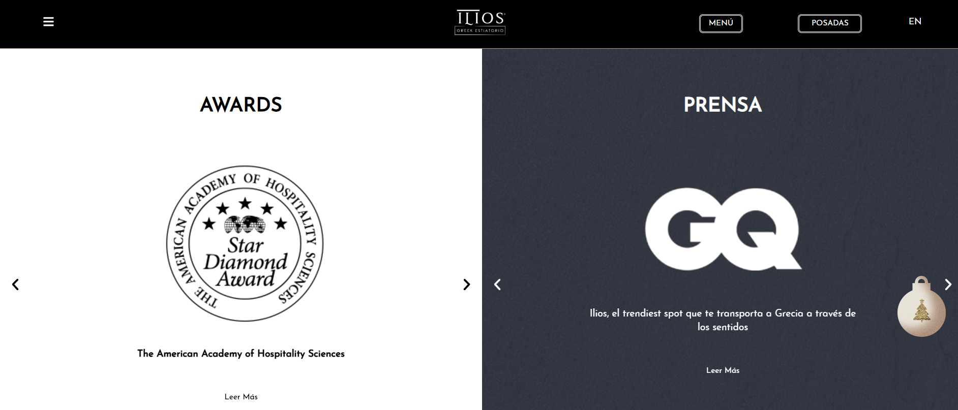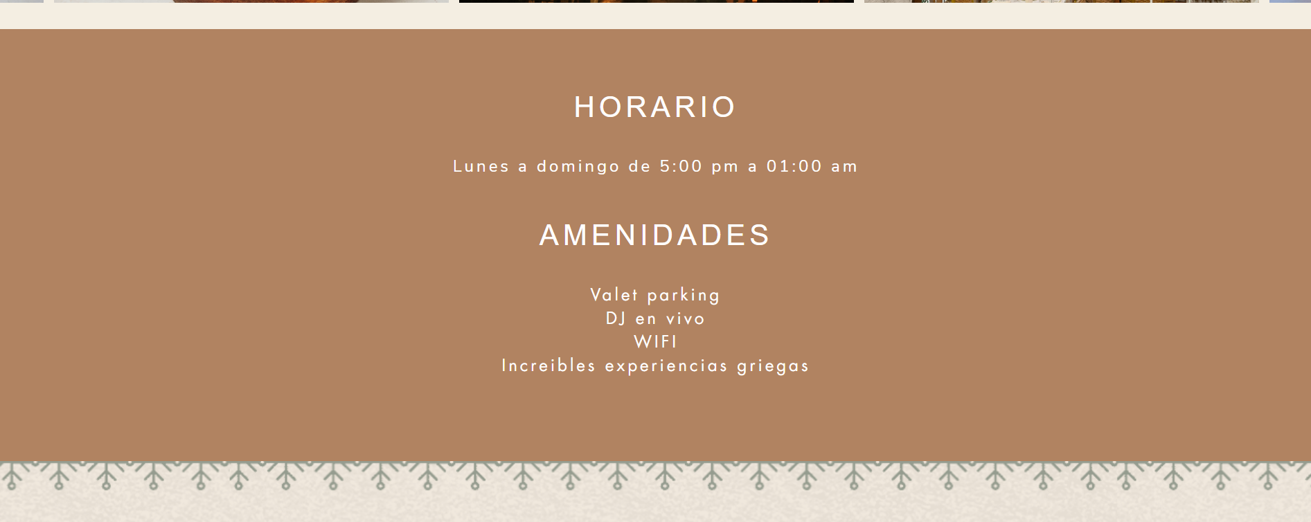 Como parte especial de la temporada, un Apartado de Navidad está dedicado a las Posadas Navideñas del restaurante. Un ícono de árbol navideño en la página invita a hacer clic y, al abrirlo, revela el programa completo de posadas, con cenas festivas y conciertos en vivo que crean una atmósfera alegre y única para celebrar la Navidad al estilo griego. Este apartado también permite a los visitantes reservar su lugar para las posadas y conocer los detalles de cada noche especial.