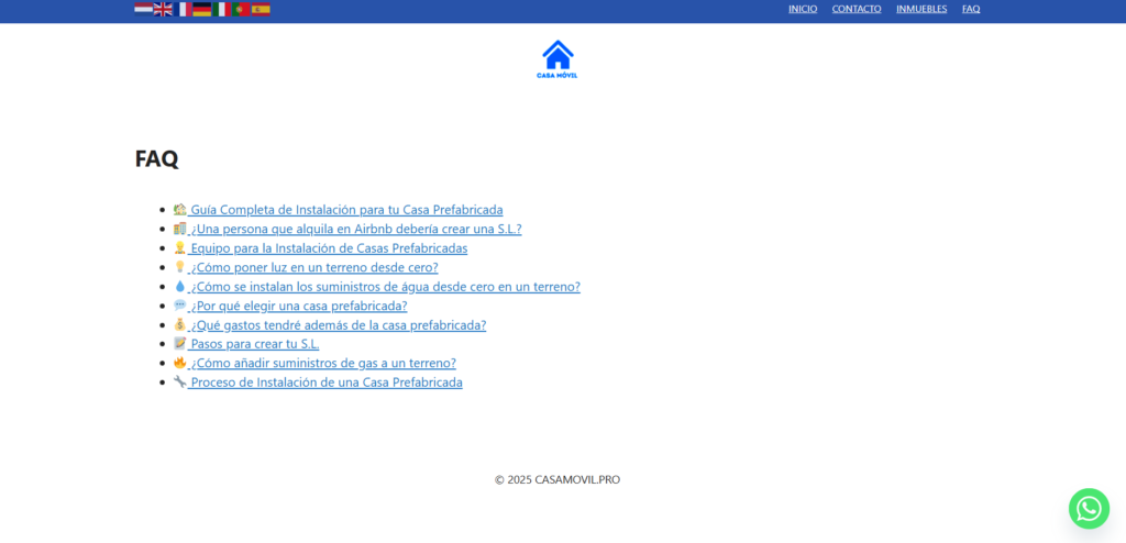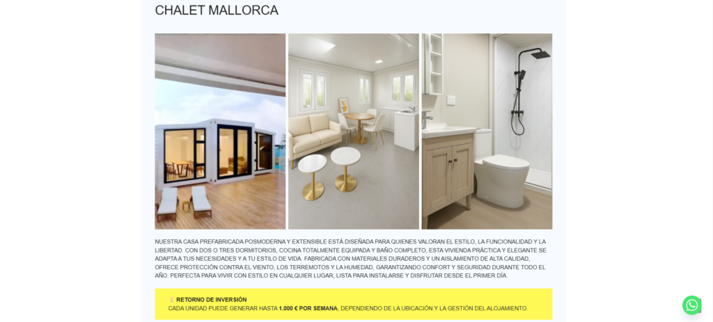 Construí un catálogo dinámico de modelos con fichas personalizadas, descripciones, fotos y precios, para que los usuarios pudieran comparar fácilmente diferentes opciones. Integré formularios inteligentes y contacto directo por WhatsApp, haciendo que el proceso de consulta fuera inmediato, algo clave para captar clientes en el sector inmobiliario. Además, optimicé todo el sitio para SEO, utilizando estrategias de posicionamiento específicas como “casas móviles en España” o “viviendas modulares”, y lo preparé para futuras expansiones o incluso la integración de e-commerce.
